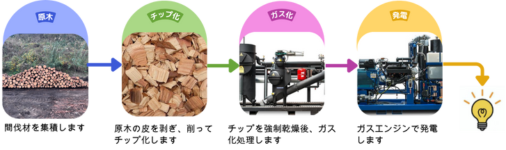 当社では熱分解ガス化方式を用いた設備を利用します。間伐材をチップに加工し、高温で熱処理することでガス化し、ガスエンジンによる発電を行います。この方式は比較的小さい設備でも高い発電効率を得ることができます。
